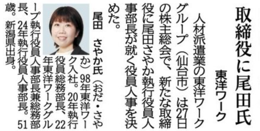 2025年11月28日付『河北新報』に、東洋ワークグループに関する記事が掲載されました。 新取締役に尾田さやか氏 東洋ワークグループ